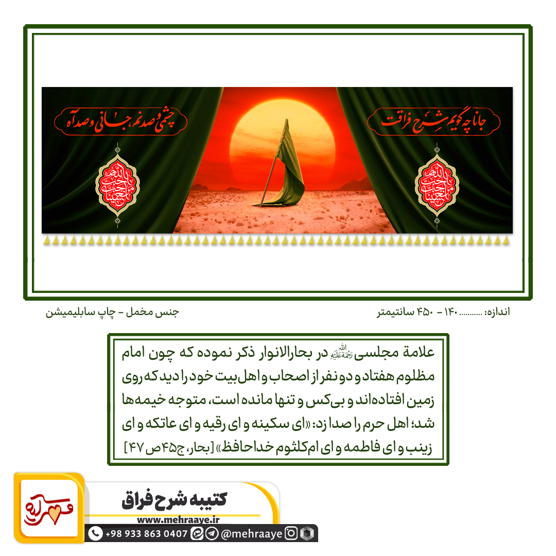 کتیبه «شرح فراق» برگرفته از واقعه عاشورا و وداع حضرت زینب سلام الله علیها با حضرت سیدالشهداء علیهالسلام است به گونهای که حضرت زینب سلام الله علیها نگاهی مایوسانه از خیمهی غریبی به پرچم حضرت سیدالشهداء علیهالسلام دارد و متضمن یک بیت شعر «جانا چه گویم شرح فراقت / چشمی و صد نم، جانی و صد آه» که هر مصراع در طرفین کتیبه قرار گرفته و ذیل هر کدام روایت «أحب الله من أحب حسینا» به زیبایی درج شده است. تلفن تماس: 09338630407 - ادمین ایتا: http://eitaa.com/admin_gomnam