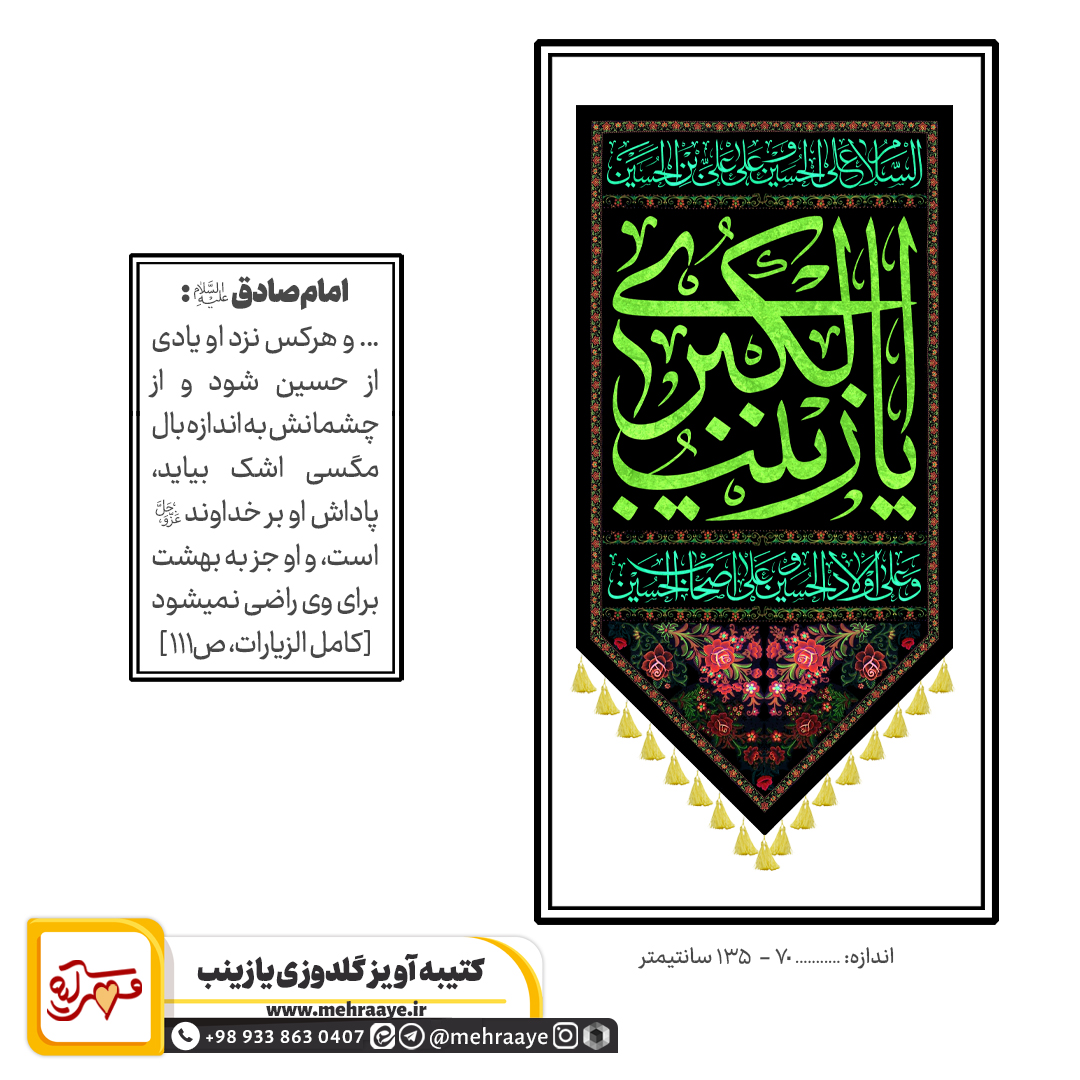 کتیبه «گلدوزی یا حسین» با استفاده از تکنیک گلدوزی طراحی شده و در حقیقت فقط طرح گلدوزی است. با توجه به اینکه گلدوزی واقعی چنین کتیبه هایی قیمت بسیار بالایی دارد این کتیبه ها، از طرفی مقرون به صرفه است و از طرفی زیبایی کتیبه های گلدوزی را نیز به همراه دارد. در مرکز کتیبه عبارت مقدس «یا حسین بن علی ایّها الشهید» و در بالای آن عبارت مبارک «الحمدلله الذی جعلنا من المتمسکین بولایة علی بن ابی طالب و الائمة المعصومین علیهمالسلام» و در پایین آن عبارت مبارک «اللهم صل علی فاطمة و أبیها و بعلها و بنیها و السر المستودع فیها بعدد ما أحاط به علمک» به صورت گلدوزی درج شده است. و در کتیبه های آویز نام مقدس «یا زینب الکبری» و «یا عباس بن علی» علیهمالسلاماجمعین در مرکز کتیبه به چشم می خورد که در بالا و پایین آن سلام آخر زیارت عاشورا درج شده است. تلفن تماس: 09338630407 - ادمین ایتا: http://eitaa.com/admin_gomnam