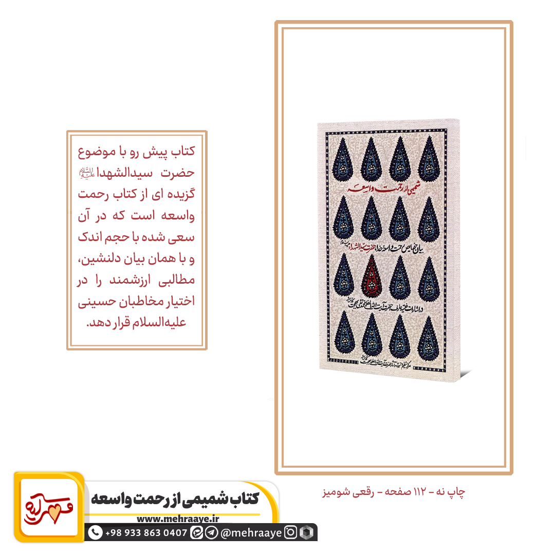 کتاب «شمیمی از رحمت واسعه» گزیدهای است از کتاب «رحمت واسعه» که شامل اشارات و مواعظ مرحوم آیتالله بهجت در باب حضرت سیدالشهدا علیهالسلام میباشد. مرکز تنظیم و نشر آثار حضرت آیت الله العظمی بهجت قدس سره برای روایت جنبه حسینی از زندگی آن عالم گرانقدر، اقدام به انتشار کتاب رحمت واسعه کرد و در این کتاب به بازتاب سیره و همچنین کلمات حضرت آیت الله بهجت قدس سره درباره مسائل مرتبط با حضرت سیدالشهدا علیه السلام پرداخت. کتاب پیش رو گزیده ای از آن کتاب است که در آن سعی شده با حجم اندک و با همان بیان دلنشین، مطالبی ارزشمند را در اختیار مخاطبان قرار دهد. تلفن تماس: 09338630407 - ادمین ایتا: http://eitaa.com/admin_gomnam