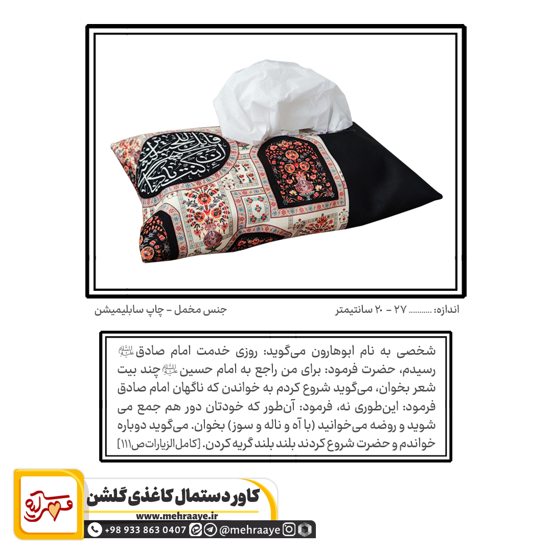 کاور دستمال کاغذی گلشن طراحی شده از نقوش و گل و بوته های سنتی است که با تم محزون برای ماه محرم و یا دیگر مراسم عزاداری اهل البیت علیهمالسلاماجمعین طراحی شده است و حال و هوای بسیار خوبی به روضه های خانگی می دهد. همچنین در میانهی این طرح عبارت «در زیر خیمه اش همگی یک خانواده ایم» به صورت دایره درج شده است. همچنین این محصول دارای پارچه آستر میباشد که ماندگاری و زیبایی محصول را دو چندان می کند. تلفن تماس: 09338630407 - ادمین ایتا: http://eitaa.com/admin_gomnam