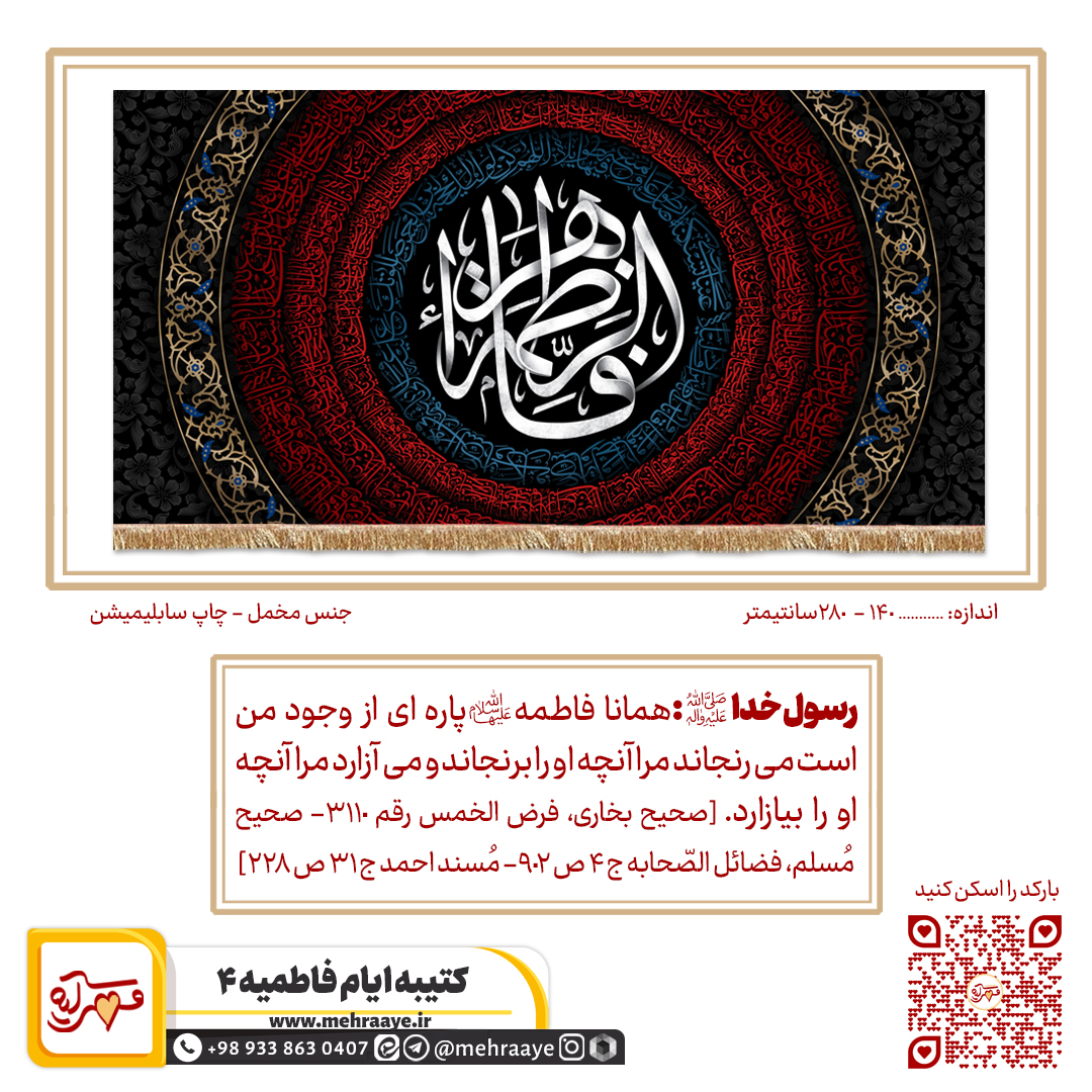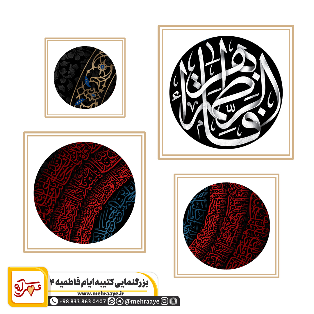 کتیبه «فاطمیه ۴» طراحی شده از خطاطی عبارت دایره ای «فاطمة الزهراء» در مرکز کتیبه و دعای سلامتی امام زمان علیهالسلام به دور آن است. همچنین عبارتی از دعای توسل سه بار به دور دعای سلامتی درج شده است که زیبایی خاصی به آن بخشیده. تلفن تماس: 09338630407 - ادمین ایتا: http://eitaa.com/admin_gomnam