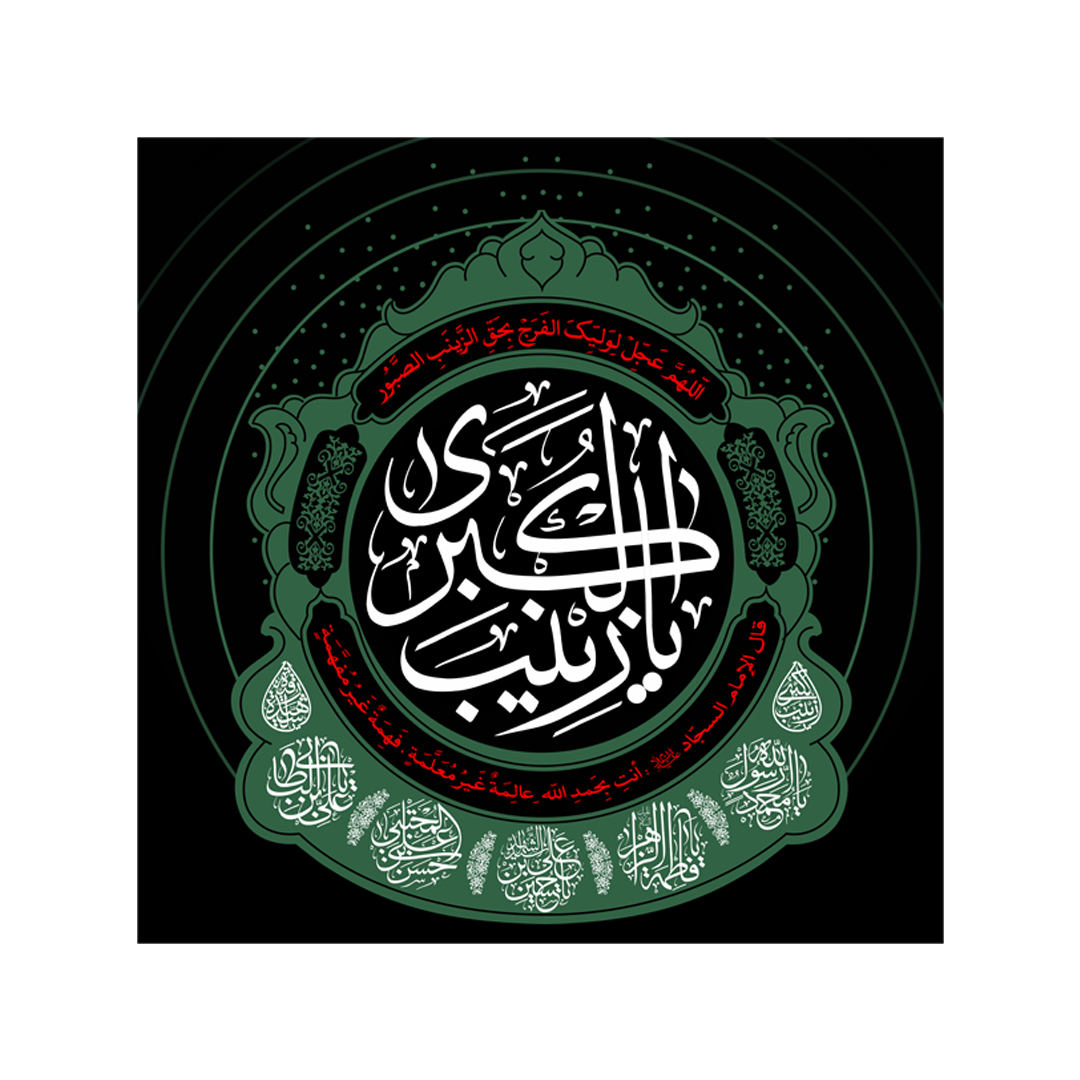 کتیبه «زینب الکبری علیهاالسلام» طراحی شده از خطاطی عبارت مبارک «یا زینب الکبری» به صورت دایره در مرکز کتیبه است که در بالای آن دعای «اللهم عجل لولیک الفرج بحق الزینب الصبور» و در پایین آن روایت امام سجاد علیهالسلام «أنت بحمدلله عالمة غیر معلمة و فهمة غیر مفهمة» درج شده است. همچنین در قسمت پایین کتیبه اسامی مقدس پنج تن آل عبا به صورت دایره و عبارت «زینب الکبری» و «زینب الحوراء» به صورت اشک در طرفین به زیبایی درج شده است. تلفن تماس: 09338630407 - ادمین ایتا: http://eitaa.com/admin_gomnam