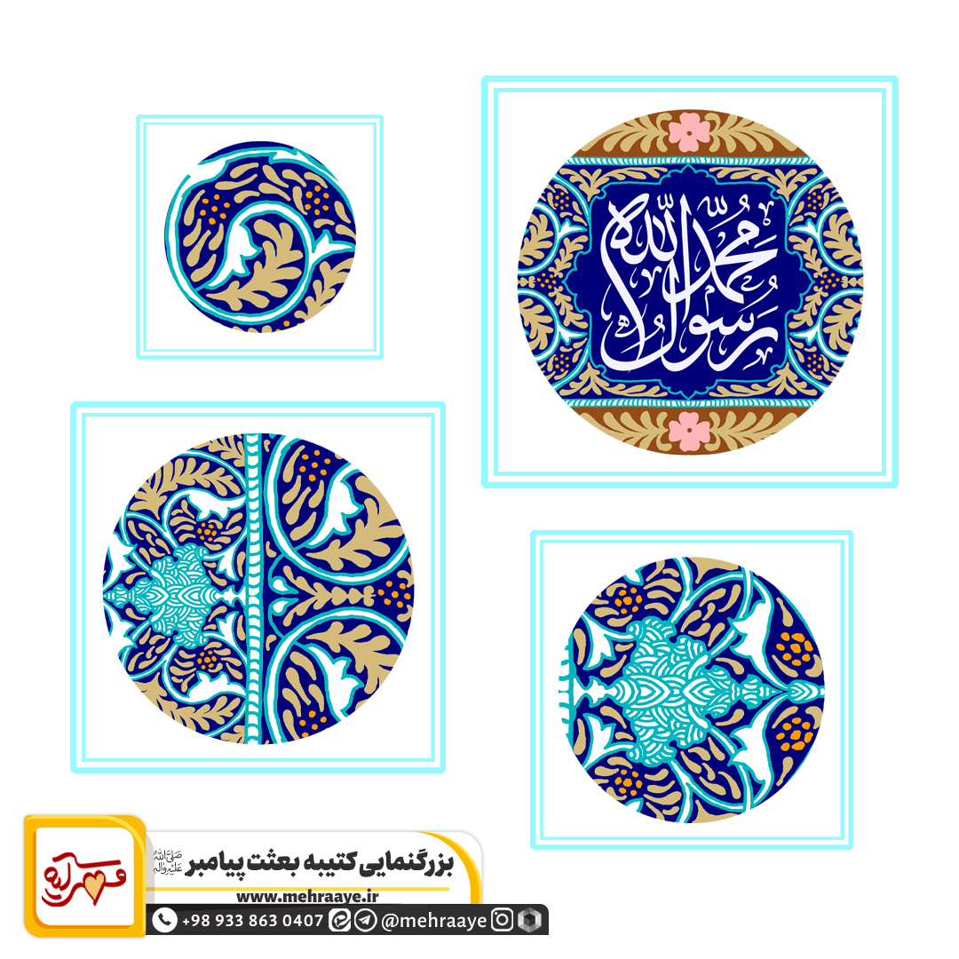 کتیبه زیبای بعثت پیامبر صلی الله علیه و آله و سلم برگرفته از نقوش اسلیمی و فانتزی و همچنین ذکر مبارک «اللهم صل علی محمد و آل محمد و عجل فرجهم» و نام مقدّس «یا محمد رسول الله» و «یا اباالقاسم یا رسول الله» طراحی شده و ترکیبی از رنگ های آبی، سفید، قهوه ای و کرم سیر که به زیبایی این کتیبه افزوده است.