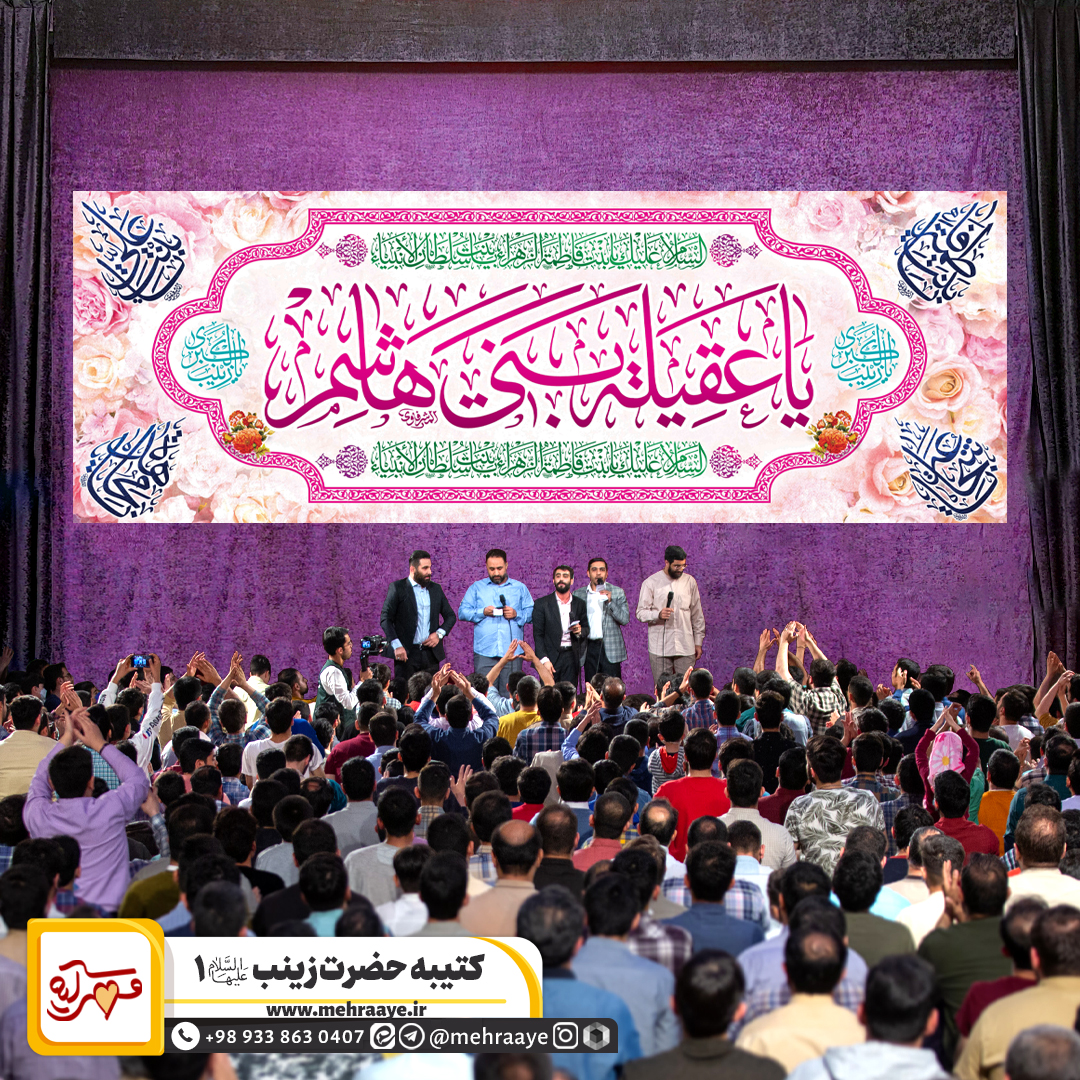 کتیبه پشت منبری «ولادت حضرت زینب علیهاالسلام ١» مناسب برای ایام ولادت حضرت زینب علیها السلام است که در هیئات و مساجد استفاده می شود. تلفن تماس: 09338630407 - ادمین ایتا: http://eitaa.com/admin_gomnam