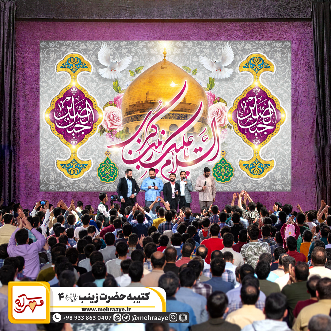 کتیبه پشت منبری «ولادت حضرت زینب علیهاالسلام ۴» مناسب برای ایام ولادت حضرت زینب علیها السلام است که در هیئات و مساجد استفاده می شود. تلفن تماس: 09338630407 - ادمین ایتا: http://eitaa.com/admin_gomnam