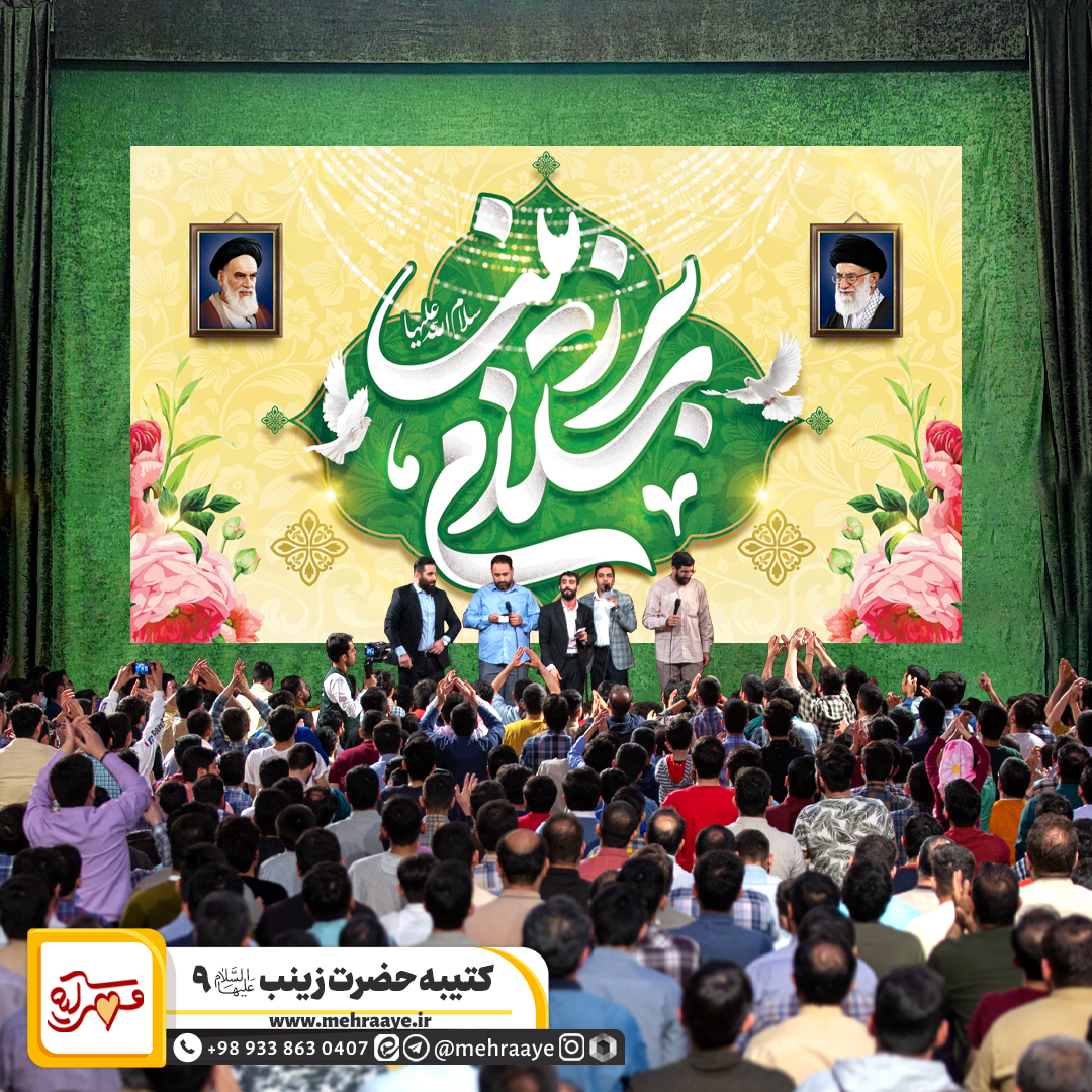 کتیبه پشت منبری «ولادت حضرت زینب علیهاالسلام ٩» مناسب برای ایام ولادت حضرت زینب علیها السلام است که در هیئات و مساجد استفاده می شود. تلفن تماس: 09338630407 - ادمین ایتا: http://eitaa.com/admin_gomnam