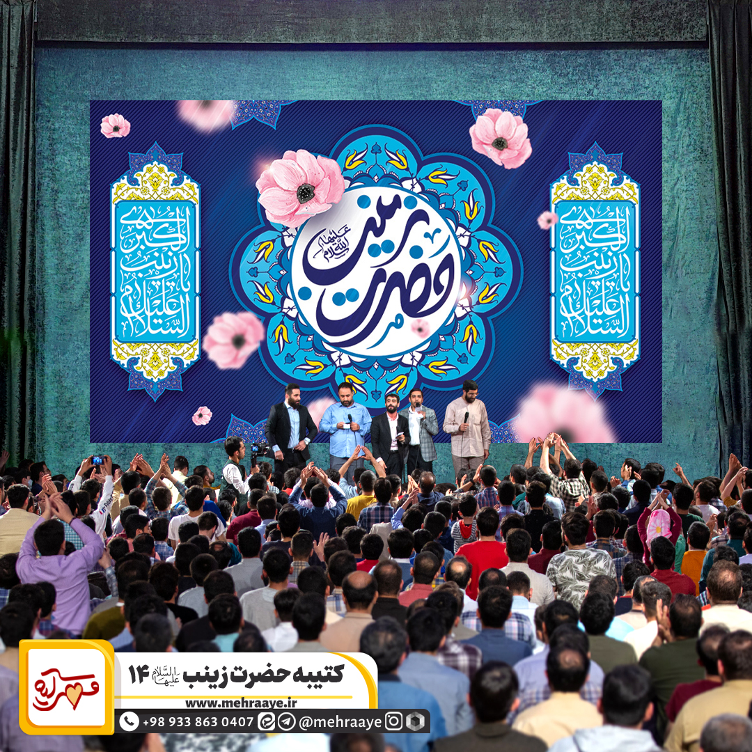 کتیبه پشت منبری «ولادت حضرت زینب علیهاالسلام ١۴» مناسب برای ایام ولادت حضرت زینب علیها السلام است که در هیئات و مساجد استفاده می شود. تلفن تماس: 09338630407 - ادمین ایتا: http://eitaa.com/admin_gomnam